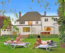 Du khách thoả sức "tám chuyện" trong trang phục "nuy" bên ngoài khuôn viên đầy cây xanh của khách sạn.