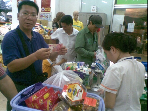 Tại một siêu thị giữa khu dân cư cách quảng trường Ba Đ́nh 3km, hai người khách Trung Quốc vào mua đồ, chủ yếu là thực phẩm. Họ sử dụng tiếng Hoa, không có phiên dịch đi cùng, và khi thanh toán họ lấy trong ví tiền ra 3 tờ 100 nhân dân tệ!? Kinh ngạc hơn nữa là nhân viên siêu thị lấy ra một xấp tiền lẻ đồng … nhân dân tệ có đủ các mệnh giá để trả lại cho khách! Trong khi đó, tờ hóa đơn của siêu thị in ra ghi hoàn toàn bằng tiếng Việt và các mặt hàng cũng ghi giá bằng tiền Việt! Tổng giá trị hóa đơn hàng đó là 658 ngàn đồng (tiền Việt Nam). Người quản lư siêu thị lúc đó cũng đứng ngay bên cạnh và chứng kiến toàn bộ quá tŕnh thanh toán, nhưng không hề có ư kiến ǵ. Nh́n cách hai ông khách mua hàng, có thể biết họ ở Việt Nam đă lâu, hoặc ít ra cũng đă đi lại nhiều lần, chứ không phải khách đi du lịch ngắn ngày. Vậy sao họ lại không đổi tiền Việt Nam để tiêu dùng khi ở Việt Nam? Khu vực quanh siêu thị này cũng không phải nơi có nhiều người nước ngoài sinh sống để người ta sẵn sàng dùng ngoại tệ trong trao đổi mua bán. Hơn nữa việc siêu thị có hẳn một ngăn đựng tiền nhân dân tệ để trả lại cho khách chứng tỏ việc thanh toán bằng đồng tiền tệ này đă có từ lâu và thành thói quen tại đây. Nhưng lạ là chỉ có đồng nhân dân tệ là ngoại tệ được sử dụng ở đây, chứ không hề có tiền đô-la Mỹ, vốn được coi là đồng tiền phổ biến nhất trên thế giới.