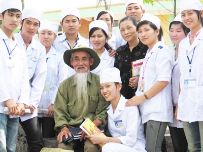 Ông Khiết giao lưu với sinh viên trường Trung cấp Y dược Đức Thiện ở Thanh Hóa.
