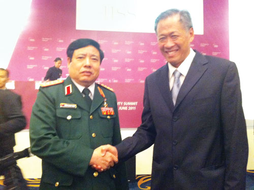 Bộ trưởng Quốc pḥng Singapore Ng Eng Hen chúc mừng sau bài phát biểu và trả lời của đại tướng Phùng Quang Thanh - Ảnh: Thục Minh |