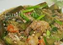 - Cho thịt vào xào trước, tiếp theo đến tôm. Thêm tiếp cà tím vào đảo đều, nêm gia vị vừa miệng, thêm chút xíu nước.