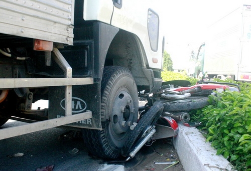 Hiện trường xe tải nuốt gọn xe máy.
