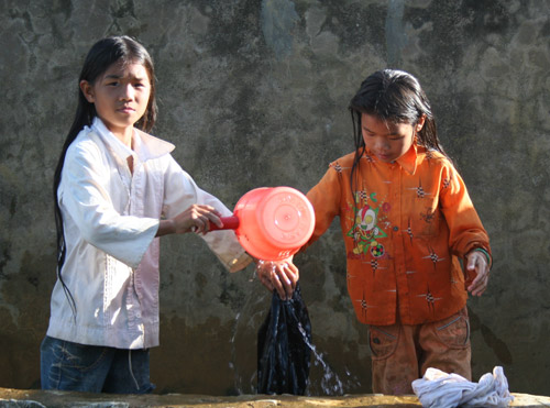 Người dân bản Khộp giặt giũ, tắm rửa bên giếng |