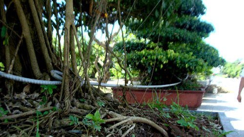 Nhưng lần này, tôi khá ngạc nhiên, vì hàng trăm cây cảnh bao quanh khách sạn biến thành… tù binh, với đủ kiểu trói buộc. Có cây bị quấn nhiều vòng cáp to chằng chịt quanh gốc, quanh chậu, rồi đóng chặt xuống đất. Đây là loại cáp xoắn rất dai, dùng để chống cắt. Rồi mỗi cây đều bị ít nhất một vòng của thanh sắt phi 16 quấn qua thân. Một thanh sắt dài cả trăm mét, gông cổ cả chục cây thành một chuỗi. Ta cứ tưởng tượng nó giống cảnh tù binh bị xích vào chân, gông vào cổ, nối đuôi nhau dài thành hàng dằng dặc.