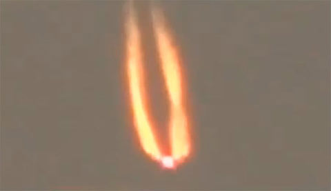 Chiếc đĩa bay bí ẩn với hai chiếc đuôi lửa xuống từ trên cao.