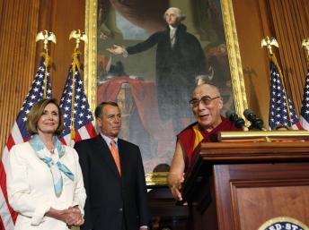 Đức Đạt Lai Lạt Ma (phải) nói chuyện với phóng viên sau khi gặp các nghị sĩ Hoa Kỳ, ngày 07/07/2011, tại điện Capitol./REUTERS
