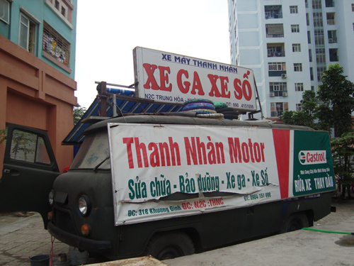 Ở Hà Nội có rất nhiều cửa hiệu sửa xe máy nhưng duy nhất có một cửa hàng mở ngay trên một chiếc ô tô.