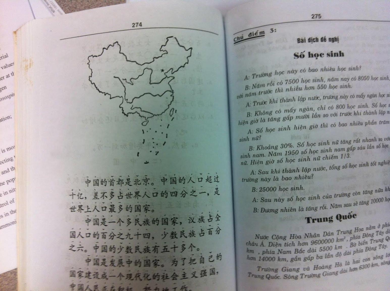 Lại phát hiện thêm một âm mưu bán nước của Đảng CSVN qua một sách cuốn sách dạy tiếng Trung với tựa đề "Luyện kỹ năng đọc hiểu Tiếng Hoa" do Ngọc Huyên biên soạn, được Nhà xuất bản Thanh niên ấn hành, ở trang 274 có in h́nh bản đồ Trung Quốc với đường lưỡi ḅ liếm gần hết cả biển Đông.