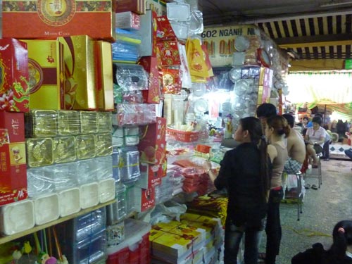 Tại các chợ này c̣n bày bán vỏ hộp (vuông, chữ nhật, hộp xéo…) in toàn chữ Trung Quốc. Hộp bánh làm sẵn c̣n in cả thành phần nguyên liệu, tem dán một trứng, hai trứng, đậu xanh, thập cẩm… với giá 10.000 đồng cho 400 con tem. Các loại bao b́ khác như: Chén nhựa đựng bánh (150 đồng - 230 đồng/cái), vỏ nhựa bao chụp bánh (280 đồng/cái), túi xách (3.000 đồng- 4.500 đồng/cái)… đều có sẵn. Tại đây c̣n bán cả gói hút ẩm, không nhăn mác, in toàn chữ Trung Quốc với giá 55.000 đồng/bịch khoảng 1.000 gói.