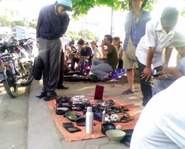 Có một gian hàng bày ngay cạnh bến xe bus trên đường Hoàng Cầu thu hút được nhiều khách đến xem. Điều khiến gian hàng này đông khách hơn chỗ khác bởi giá cả những món hàng ở đây khá rẻ. Có những chiếc điện thoại di động Nokia được ông chủ bảo “xịn” nhưng giá chỉ 100.000 đồng. Người mua có kinh nghiệm ngắm nghía rồi trả giá 30.000 đồng, ông chủ cũng vui vẻ đồng ư bán. Nh́n những chiếc kính râm đủ loại được xếp thành hàng trên tấm vải, tôi ṭ ṃ ngó xuống xem thử và hỏi người bán hàng: “Bao nhiêu tiền chiếc kính này anh?”. “10 ngh́n thôi!”. Giá “chốt” cuối cùng là 5 ngh́n cho một chiếc kính mà theo lời nhận xét của anh bạn đồng nghiệp là c̣n khá “mới” và hợp thời trang.