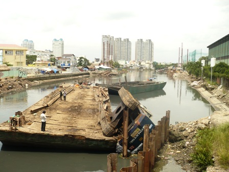 Lúc này, sà lan số hiệu SG 2591 chở xe cẩu mang biển số 50XA-1123 đang tiến hành neo đậu sát bên ngoài tường rào Xí nghiệp vỏ tàu - Cty THHH MTV Ba Son, thi công đóng cừ lá sen tạo chân móng xây dựng bờ kè Nhiêu Lộc- Thị Nghè. Tài xế đang vận hành xe cuốc để đóng cừ lá sen xuống bùn thì bất ngờ chiếc xe bị nghiêng lật nhào, phơi bụng trên dòng kênh.
