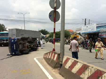 - Trong lúc có rất nhiều phương tiện xe máy đang dừng chờ qua đường tại giao lộ, bất ngờ xe tải 15 tấn chở đầy đá lao xuống tông vào 1 xe tải làm lật nhào. Hàng chục người may mắn thoát chết.