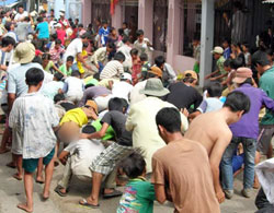 Tiền xu được chủ nhà tung ra đường khiến mọi người nháo nhào giành giật.