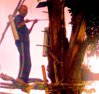 Già làng Pơloong Pấc lấy rượu Tà-vạt từ ngọn cây