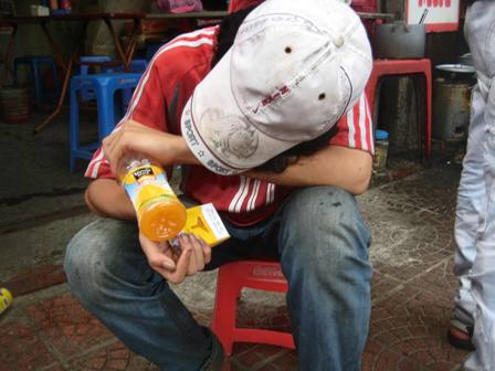 Trời đă bắt đầu tắt nắng. Không c̣n đủ kiên nhẫn tiếp tục ngồi một chỗ chờ đợi, tôi đánh liều lên đường tàu, nơi tập trung chích hút của các con nghiện. Dọc đường ray, chốc chốc tôi lại bắt gặp những chiếc xi lanh nằm chỏng chơ. Vài thanh niên thản nhiên ngồi chích thuốc. Cạnh đó là mấy chị phụ nữ ngồi trước cửa nhặt rau cho bữa cơm chiều, mấy em nhỏ chơi đùa quanh chân mẹ.