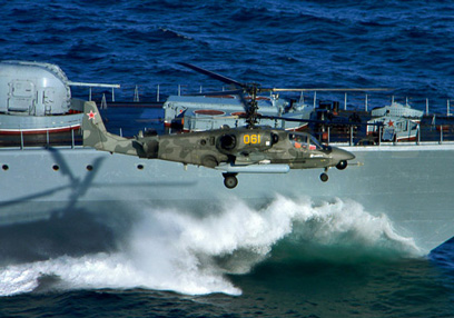 Máy bay trực thăng tấn công Ka-52 Alligator được thiết kế bởi OKB Kamov và sẵn sàng cho các cuộc tuần tra lănh thổ hàng hải, dựa vào nguyên mẫu Ka-50 Black Shark (Cá Mập Đen).