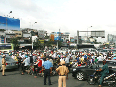 Dòng xe máy, ôtô hướng từ cầu Bình Triệu vào trung tâm TP HCM phải nhích từng bước, len lỏi qua nút giao thông.