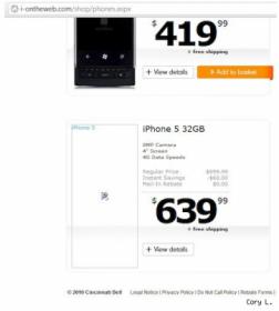 Trang FlashGear xuất hiện thông tin cho biết nhà mạng Cincinnati Bell (Mỹ) đă đăng tải thông tin về mẫu iPhone 5 và iPhone 4S cùng giá và cấu h́nh cơ bản. Theo thông tin trên Cincinnati Bell, iPhone 5 sẽ có màn h́nh 4 inch, camera 8 MPx và hỗ trợ mạng 4G… iPhone 5 phiên bản 32 GB sẽ có giá 639,99 USD.
