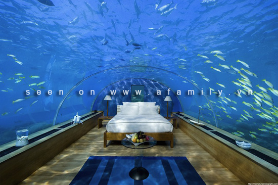 Nhà hàng bên dưới mặt nước Căn phòng tuyệt mỹ nằm ở độ sâu 5 mét so với mực nước biển Ấn Độ Dương, thuộc địa phận đảo Rangali, bao quanh bởi một rặng san hô và được bọc hoàn toàn bằng kính acrylic trong suốt. Cũng chẳng lạ khi bài ca đại dương chỉ được cất lên với một mức giá khiến "dân thường" như chúng ta phải rớt nước mắt: 11.710 đô la Mỹ (xấp xỉ 250 triệu VNĐ). Không chỉ vậy, khách hàng còn phải gọi điện đặt trước ít nhất là 14 ngày để được tận hưởng một đêm trong căn phòng ấy.