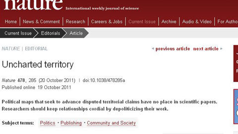Điều này th́ liên quan ǵ tới khoa học và những tạp chí như Nature? Không hề - ngoại trừ rằng những xung đột lănh thổ trong đó có Biển Đông, đang ṛ rỉ vào các trang tạp chí khoa học. Theo một xu hướng đáng lo ngại, ngày càng có nhiều các bản đồ đi kèm với các bài báo khoa học của các nhà nghiên cứu Trung Quốc trong đó mô tả một đường đứt khúc trùm lên đa số Biển Đông nhằm khẳng định chủ quyền của Trung Quốc. Có thể hiểu được sự giận dữ từ các nhà khoa học và công dân những nước láng giềng liên quan đối với các bản đồ này, và đa phần là chúng không hề liên quan tới đề tài bài nghiên cứu được công bố. Việc đưa vào đường đứt khúc này không thể là một thông điệp mang tính khoa học, mà hẳn là một thông điệp mang tính chính trị, được gửi theo yêu cầu từ chính phủ Trung Quốc. Đây là một tuyên bố chủ quyền lănh thổ, được đưa vào không đúng chỗ.
