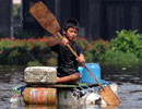 Một cậu bé chèo chiếc thuyền được làm từ xốp và các thùng nhựa ở Bangkok hôm 24/10. Ảnh: AFP