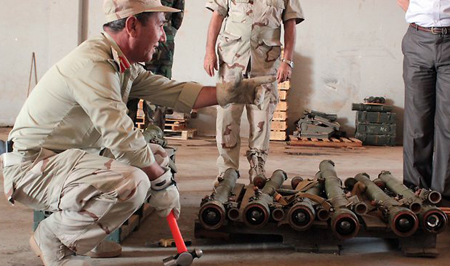 Một quan chức quân đội của chính phủ lâm thời Libya vô hiệu hoá các tên lửa vác vai SAM-7 tại Benghazi.