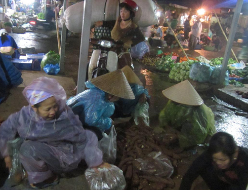 Có mặt tại chợ nông sản Văn Quán (Hà Đông, Hà Nội) lúc 1h sáng chúng tôi mới thấy được nỗi vất vả, nhọc nhằn của những “thân c̣ lặn lội” trong đêm như thế này. Trời mưa phùn càng làm tăng cái giá lạnh, lác đác có mấy hộ buôn đến sớm săm sắn thắp đèn, chuẩn bị xếp hàng ra bán. C̣n lại một số gian vẫn trống trơn. Tôi đến bắt chuyện và làm quen với vợ chồng bà Chiến. Dường như vợ chồng ông bà đến chợ sớm nhất. Bà Chiến quê ở xă Tự Nhiên, Thường Tín, Hà Nội. Tính đến thời điểm này, bà theo nghề chạy chợ được ngót nghét 8 năm: “Nghề chạy chợ đêm vất vả lắm, hôm nào cũng phải dậy từ lúc 11 rưỡi đêm. Có tối vừa chợp mắt được chừng 1 tiếng th́ chuông báo thức đă kêu vang. V́ hàng nặng nên phải chuẩn bị sắp hàng cho kịp giờ. Ông lăo nhà tôi cầm lái nên được đặc cách ngủ hơn tôi chừng 30 phút, để tránh ngủ gật giữa đường nguy hiểm”, bà Chiến cười, chia sẻ.