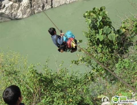 Đu dây qua sông là một thực trạng lâu nay ở thung lũng Nujiang, phía bắc tỉnh Vân Nam, nơi mà hàng ngày, 60 học sinh gan dạ phải đu dây qua sông Nu để tới trường.