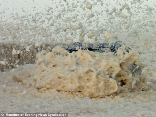 Nhìn qua thì cứ tưởng đường phố thị trấn Cleveleys ở Anh đã biến thành một “xứ thần tiên” bao phủ bởi màu trắng tinh khiết của tuyết, nhưng người dân sống ở đó lại đang khá khổ sở vì phải chống chọi với hàng chục lít bọt biển tấn công bất thường.