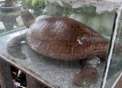 Dẫn chúng tôi tới tham quan nơi đặt xác rùa, người quản lý chỉ vào hai chân sau của “cụ rùa” đã bị gãy sau hai lần “vận động”: “Lần ấy cứ mải lo chuyện cái tủ kính nên tôi cuống cuồng lấy băng dính trắng dán lại hai chân cho “cụ”. Giờ nhìn lại cũng thấy tính thẩm mỹ… không cao. Mong “cụ” bỏ qua mà không trách phạt tôi”, người đàn ông này cười phân bua.