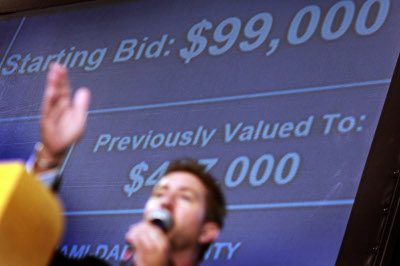Khung cảnh bán đấu giá nhà tại Miami Beach, Florida. Mua nhà bị ngân hàng xiết, bán đấu giá, là một cách đầu tư có thể lời to, nhưng không dễ thực hiện. (H́nh: Joe Raedle/Getty Images)