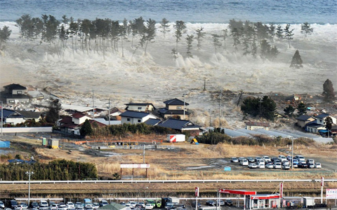 14h46 ngày thứ sáu 11/3/2011, một cơn địa chấn mạnh 9 độ Richter xảy ra ở ngoài khơi bờ biển vùng Đông Bắc của Nhật Bản, kéo theo những con sóng thần ập vào bờ ngay sau đó. Trong ảnh là một con sóng thần tràn vào thành phố Miyako, tỉnh Iwate. Có số liệu cho hay thành phố này phải đón nhận đợt sóng thần cao tới 40 m. Ảnh: