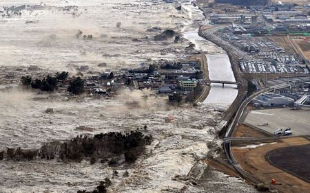 Cơn sóng thần hung bạo tấn công thành phố Iwanuma, tỉnh Miyagi. Thảm họa kép kinh hoàng này khiến khoảng 19.000 người ở vùng Đông Bắc của Nhật Bản thiệt mạng và mất tích. Công việc tìm kiếm người còn mất tích vẫn đang diễn ra. Ảnh: