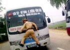Mặc cho viên cảnh sát giao thông bám vào cần gạt nước, ra hiệu lệnh dừng nhưng lái xe khách vẫn tăng ga bỏ chạy hơn một km.