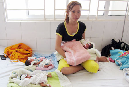 Đó là trường hợp của chị Lê Thu Xuyên (SN 1995, quê thôn 1, xã Long Điền Tây, huyện Long Hải, tỉnh Bạc Liêu). Chị Xuyên nhập viện và sinh nở vào ngày 18/4 được 3 bé gái. Bé thứ nhất nặng 0,9kg; bé thứ hai nặng 1,4kg và bé thứ ba nặng 1,4kg.