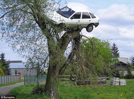 Sững sờ thấy cả xe lẫn người cheo leo trên... ngọn cây