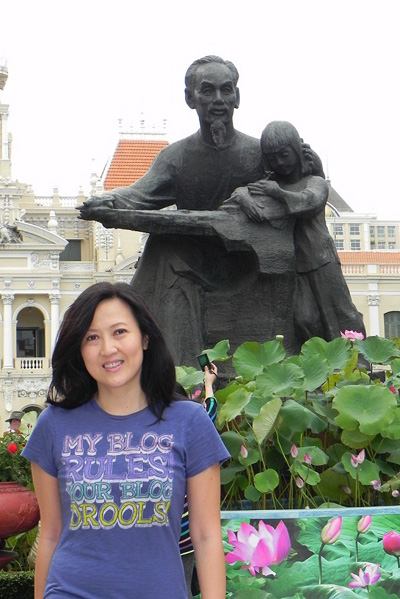 Tác giả Evelyne bên tượng Bác Hồ trước trụ sở UBND TP.HCM - Ảnh: Kevin M