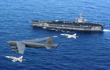 Một máy bay ném bom B-52 cùng 2 chiến đấu cơ F/A-18 Hornets bay gần tàu sân bay Mỹ USS Nimitz. Thông tin trên được một quan chức cấp cao của Bộ quốc pḥng Mỹ cho biết hôm 1/8. Ông Robert Scher, phó trợ lư Bộ trưởng quốc pḥng Mỹ về các kế hoạch, nói Lầu Năm Góc sẽ xem xét việc điều thêm các khí tài tới đảo Guam, trung tâm chiến lược của Mỹ ở phía tây Thái B́nh Duơng và điều này đă được đề xuất trong một nghiên cứu độc lập về các kế hoạch quân sự của Mỹ trong khu vực.