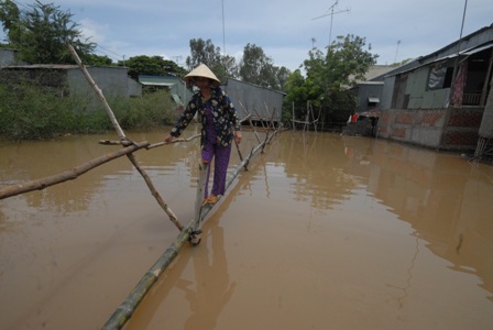 Đến mùa nước nổi, cầu khỉ trở thành "cầu dẫn" từ nhà ra đường