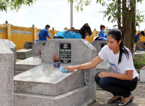Ngọc Hân lau sạch bia mộ liệt sĩ trong hành trình về nguồn.
