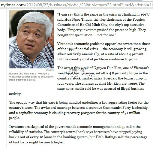 Tuần này, vụ bắt giữ Nguyễn Đức Kiên, một trong các thương nhân giàu nhất Việt Nam, đã làm chỉ số chứng khoán của đất nước sụt 4,8% vào hôm thứ ba, mức sụt giảm lớn nhất trong bốn năm qua. Lý do buộc tội ông Kiên còn rất mơ hồ. Truyền thông nhà nước cho biết ông bị buộc tội hoạt động kinh doanh bất hợp pháp.