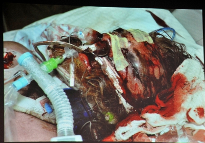 Kelly Thomas, một người vô gia cư bị tâm thần, lúc c̣n nằm bệnh viện sau khi bị cảnh sát hành hung. (H́nh: Pool/Gettyimages)