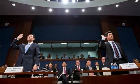 Các giám đốc điều hành của hai công ty Trung Quốc Huawei và ZTE tuyên thệ ở Quốc hội Mỹ, Washington, trước khi trình bày liệu sự mở rộng của họ ở thị trường Mỹ có gây ra một mối đe dọa đối với an ninh nước này hay không. (Ảnh: AP)