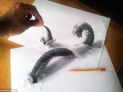 Ramon Bruin, một họa sĩ tự do người Hà Lan đã sáng tạo những bản vẽ 3D đáng kinh ngạc trên giấy. Những loài côn trùng, chim và rắn trông sống động y như ngoài đời thực vậy.