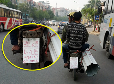 Sáng ngày 1/11, nhiều người tham gia giao thông trên phố Vũ Phạm Hàm (Cầu Giấy, Hà Nội) bị thu hút bởi h́nh ảnh 2 nam thanh niên chở nhau trên một chiếc xe máy cũ nát, người ngồi sau không đội mũ bảo hiểm. Chiếc xe này được chằng buộc thêm bên cạnh một tấm tôn quá khổ được cuộn tṛn. Tấm tôn cồng kềnh khiến người điều khiển xe máy phải co chân phải trong khi di chuyển và cũng không thể nhấn được phanh giảm tốc độ của chiếc xe.