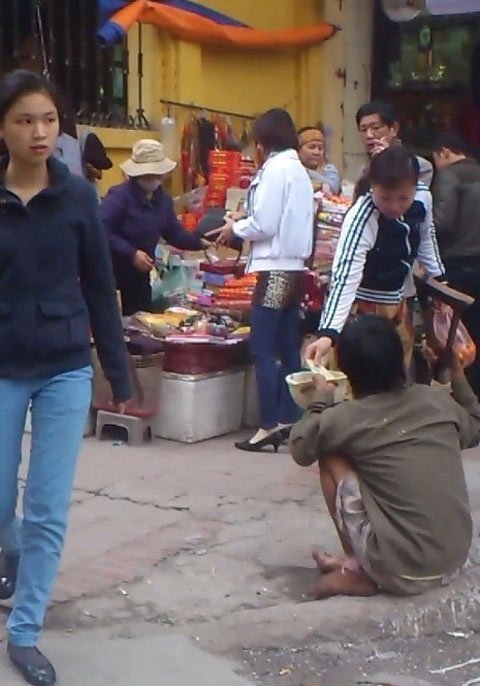 Thấy tôi dừng chân, nét mặt gã chuyển sang trạng thái nhăn nhó đến tội nghiệp. Cùng hai người đi đường khác, tôi cũng dành cho gã chút “lòng hảo tâm”. “Cháu bị ngã, bị bỏng vôi. Đau lắm cô ơi…” – giọng gã đầy van lơn khi có người hỏi thăm đôi chân bỏng đang lết đi giữa cái lạnh của tiết trời mùa đông và cái bụi bẩn của đường phố Hà Nội. Giọng van lơn đấy nhưng gã cũng nhanh chóng tìm cách tránh phải trả lời thêm bất kì câu hỏi nào liên quan tới đôi chân của mình.