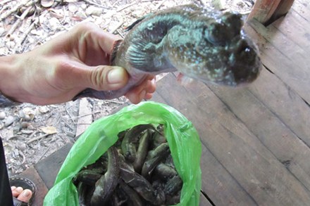 “Ăn nhiều đi, chú Hai” - ông Sáu gắp bỏ vào chén tôi nguyên con cá thòi lòi nướng cháy cỡ 3 ngón tay còn lồi hai mắt. Ông bảo đây là cá con, cá thòi lòi trưởng thành có thể to bằng cổ tay người lớn (tương đương 300 - 400gr).