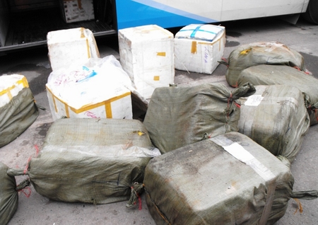 20 thùng xốp chứa ḷng lợn, tràng… không đảm bảo vệ sinh được lực lượng chức năng phát hiện trong khoang hành lư của xe khách ở bến xe Nước ngầm vào khoảng 12h45 phút ngày 14/1.