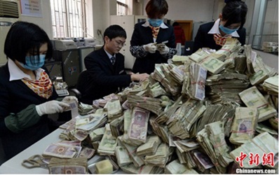 Những cọc tiền lẻ ngổn ngang tại pḥng kiểm tiền ngân hàng Trịnh Châu.