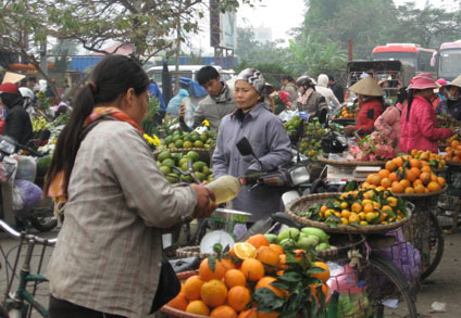 Những ngày cuối năm, dân ngoại tỉnh đổ Hà Nội buôn bán hoa, các loại trái cây, sản phẩm may mặc thanh lư… gia tăng đột biến khiến đường phố thủ đô càng thêm đông đúc. “Thức dậy từ 2 giờ, lên chợ Long Biên cất hàng về chợ đầu mối phía Nam bán từ 4 giờ đến 12 giờ, nếu hàng ế th́ phải bán rong trên các phố đến tối mịt”, chị Thắm một người bán hàng hoa quả kể.